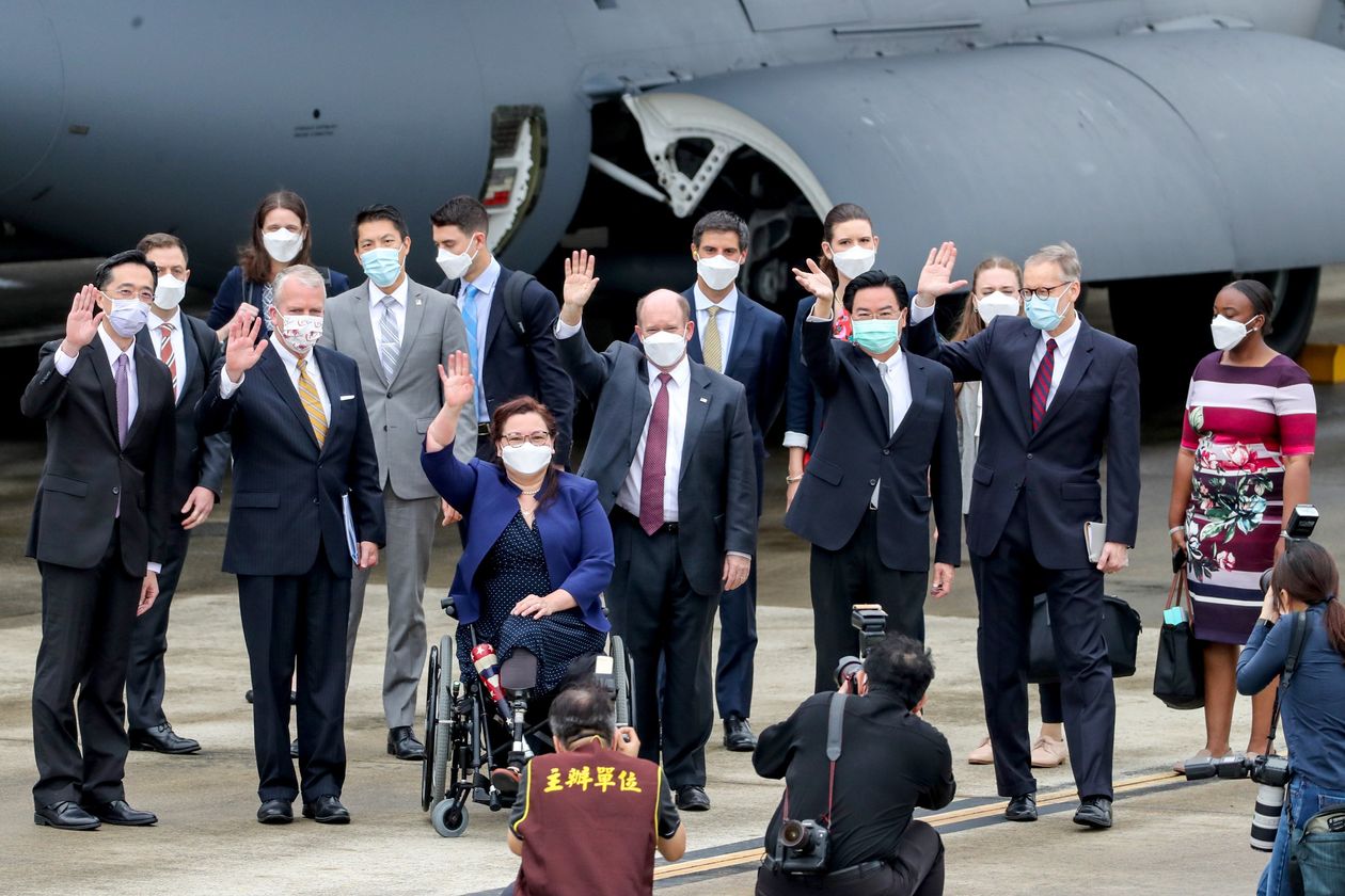 Earlier this week, several U.S. senators visited Taiwan for bilateral relations meetings. Above in a handout photo, Sens. Dan Sullivan (R., Alaska) in yellow tie, Tammy Duckworth (D., Ill.) in wheelchair and Chris Coons (D., Del.) in red tie with members of the delegation. PHOTO: TAIWAN CENTRAL NEWS AGENCY/ZUMA PRESS
