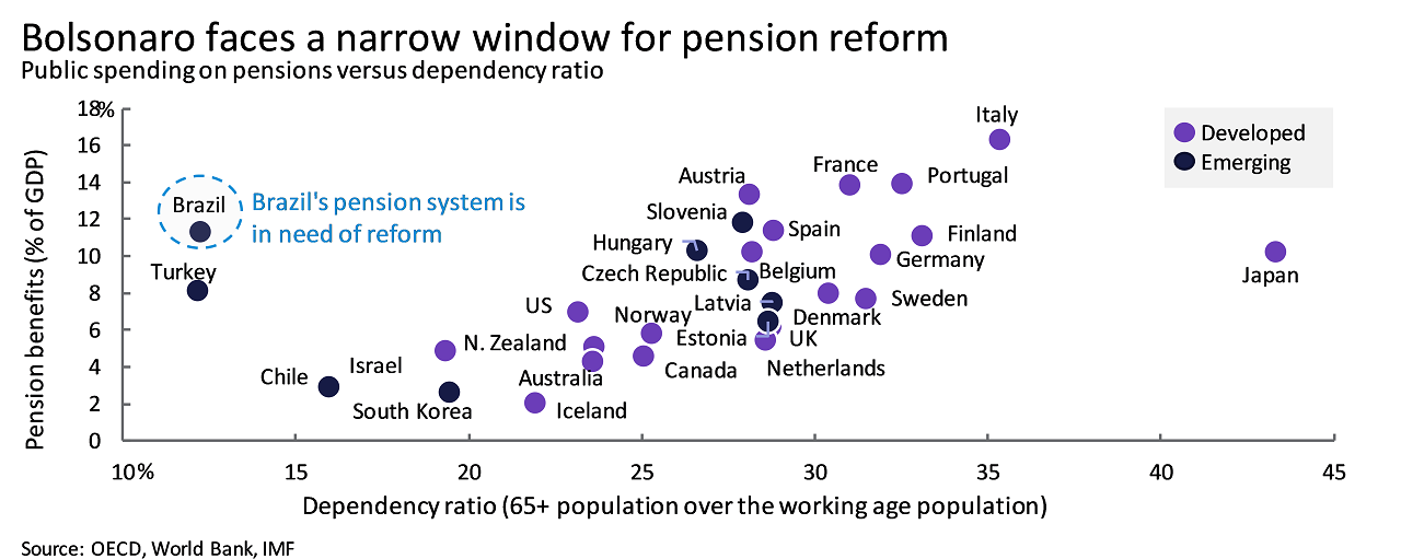 Bolsonaro's main economic challenge will be to address the country's severe fiscal imbalances, including its unsustainable pension system. Pension reform will be critical this year – without it, debt dynamics could deteriorate and the economic recovery would likely come to an end. We expect that Bolsonaro will be able to deliver on at least a moderate version of pension reform this year, which could help boost confidence in the economy.