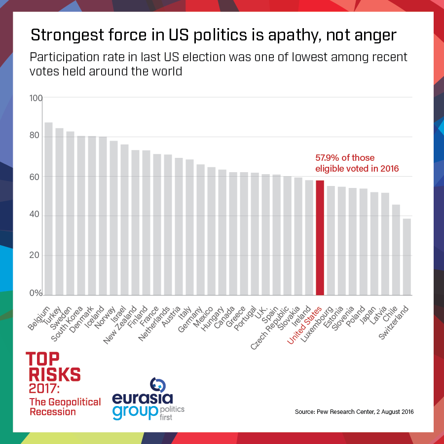 At least for 2017, the US domestic outlook is neutral to positive. Reducing some regulation, investing in infrastructure, bringing down corporate tax rates, simplifying the individual tax code—at worst it's slow and incremental, at best it's a near-term plus from a growth perspective. There's plenty of longer-term downside if mishandled: a spiraling deficit if investments don't bring returns, privatization deals that lead to corruption and inefficiency, widening mistrust between haves and have nots if the jobs aren't created. But there's no serious social instability in the country. It's important to remember that in the most important election of their lifetimes, nearly half of eligible Americans didn't bother to vote. The critical political driver for the US at home this year remains political apathy. Given all the heat of political debate that we'll hear this year, it's worth keeping that in mind.