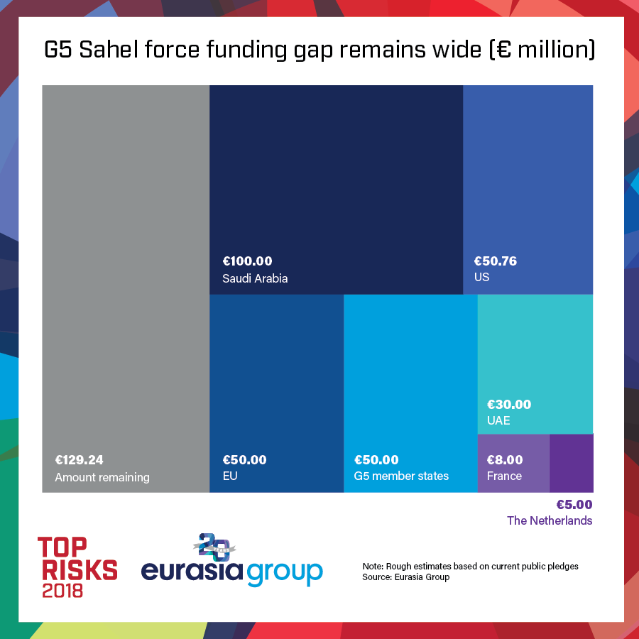 Foreign partners who have helped stabilize weak governments in the past are distracted. In the east, a preoccupied Europe has reduced its salary support for troops of the UN-mandated African Union Mission to Somalia operating in the Al Shabaab hotspot. Across the Sahel, the G5 counterterrorism partnership of Chad, Niger, Burkina Faso, Mali, and Mauritania plans to launch a 5,000-strong force in March 2018. But differences among France, the US, and UN officials will slow the necessary funding, leaving the region at risk, despite an injection of financial support from Saudi Arabia and the UAE.