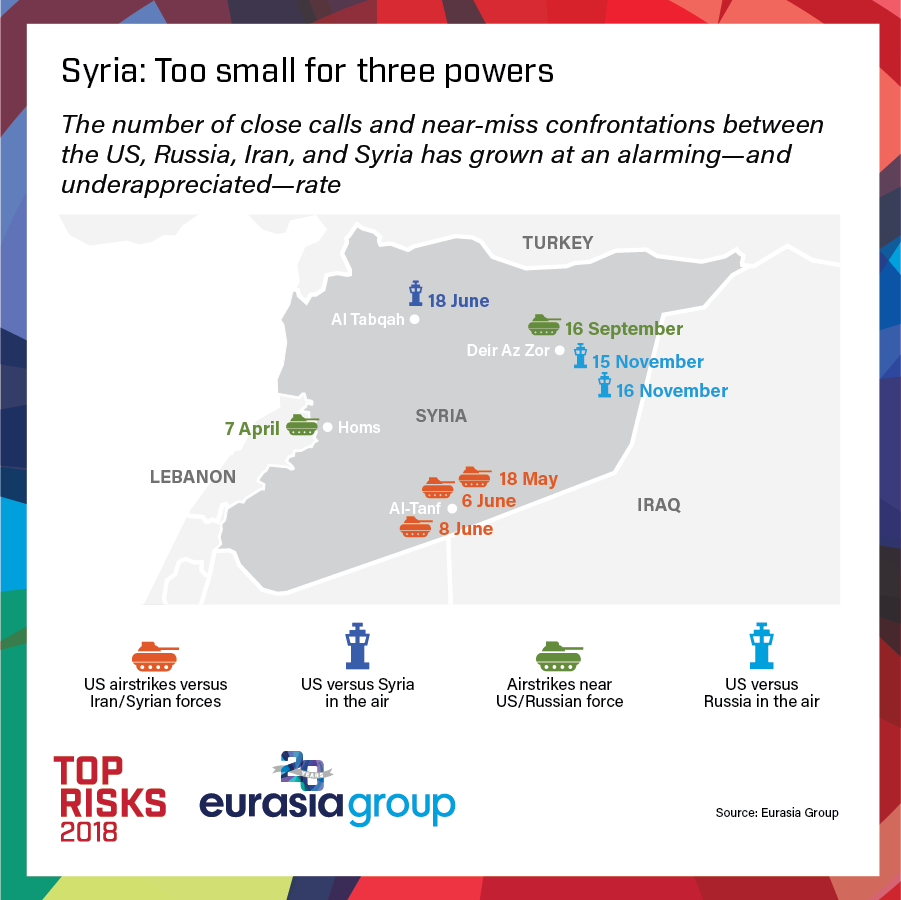 Syria. The war in Syria will continue to wind down in 2018, but there will still be plenty of destructive hardware in the field carried by actors in close proximity who don't like or trust one another. Russian and US bombers regularly fly into each other's demarcation zones, and strikes in the wrong place could kill US or Russian troops. US soldiers are embedded with Kurdish forces around Raqqa and other areas east of the Euphrates, and they could become a target for Russia and Iran. It's the Washington-Tehran relationship that's most dangerous in Syria. Trump wants Iran out of the country.