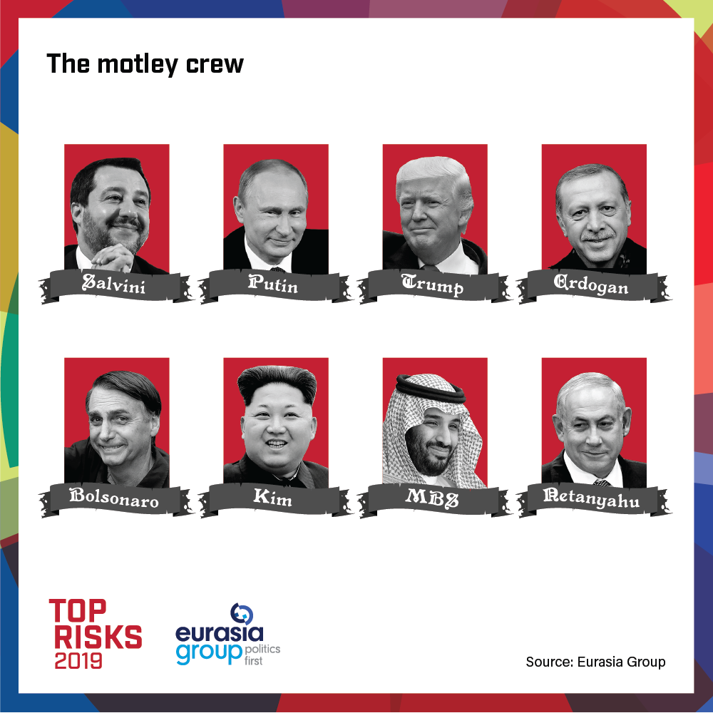 In the aggregate, this coalition will speed the erosion of the international system. Putin and Salvini have become more mainstream, and greater acceptance boosts their revisionist goals. All these men are unpredictable, which makes geopolitics and investing riskier. Mohammed bin Salman isolated Qatar, disrupted relations with Canada, and—in the opinion of US intelligence—ordered the killing of a prominent critic. All were bolts from the blue. Putin's penchant for the unexpected is also well-documented. And members of this “coalition” all have outsized egos. That means that the need to feed the political base—not the greater good—will play outsized roles in their decision-making.