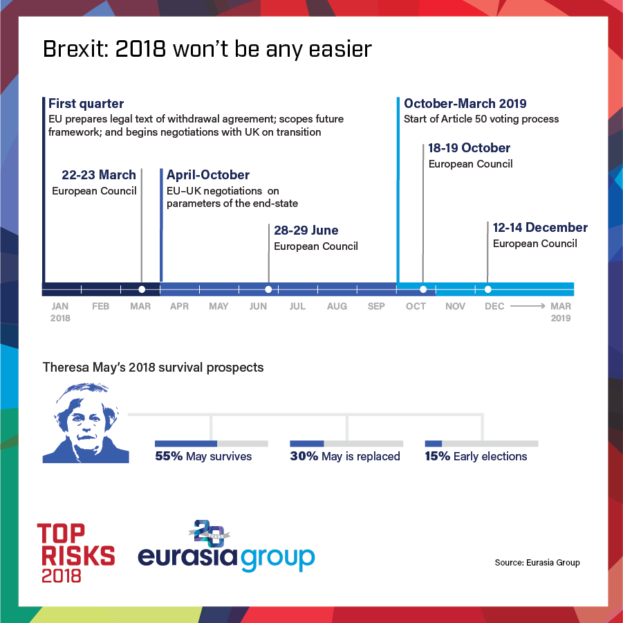 2017 MAY NOT HAVE BEEN FUN FOR THE UK; 2018 will be worse. The country's troubles will come from both acrimonious Brexit negotiations and difficult domestic politics.