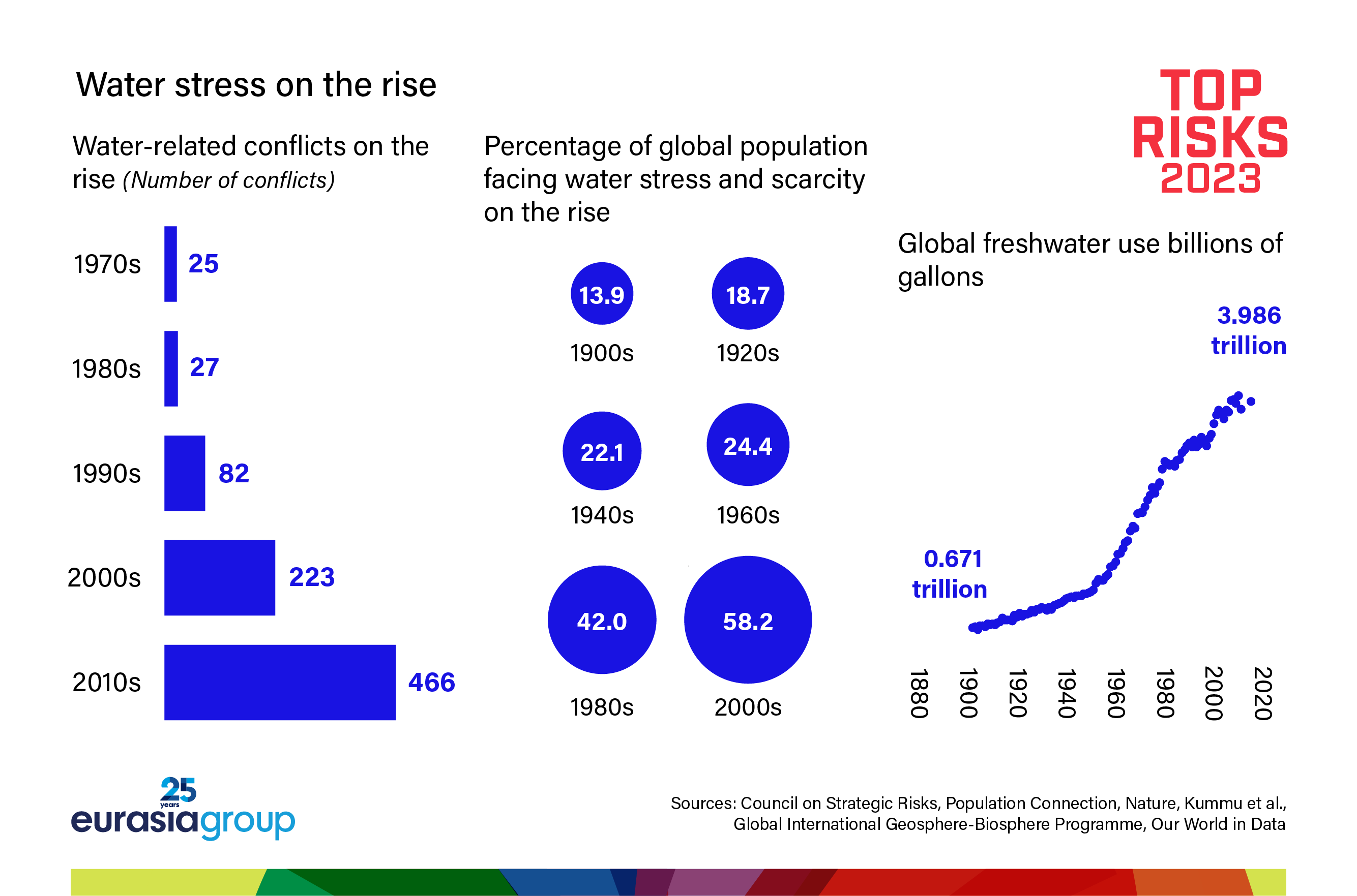 Within countries, the number of water-related conflicts, already up sharply since the 1980s, will reach new heights in 2023. The impact will be greatest in the Middle East and Africa, where water will act as a “trigger” in places where militias fight over the scarce resource, and as a “casualty” in places where militants destroy water pumps, tanks, and pipes. Water scarcity will also trigger refugee flows in the Middle East (Syria, Iraq, and Yemen), threaten economic prospects in North Africa (Algeria, Morocco, and Tunisia), and heighten food insecurity in the horn of Africa (Ethiopia, Kenya, Somalia) by driving food prices higher and forcing farmers to migrate. The spillover effects on domestic inequality will increase social unrest in those places where they combine with other economic and social crises, including high inflation, unemployment, disease outbreaks, and energy shortages.