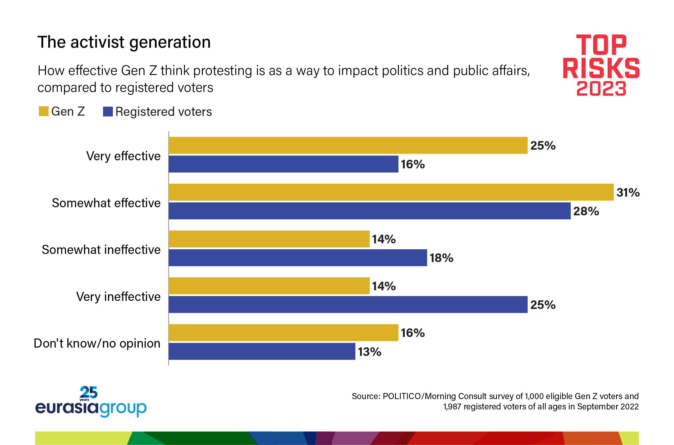 This generation is now coming of age, entering the workforce and political life. Gen Z currently makes up 30% of the world's population and is expected to comprise 27% of the global workforce by 2025. In the United States, Gen Z turned out in record numbers for the 2022 midterm elections, helping to hold off a Republican “red wave” by breaking in favor of Democratic candidates in swing states such as Pennsylvania and Michigan. And while its power at the ballot box will only grow, Gen Z's political influence already extends further owing to its outsized role in campaigns organized on social media.