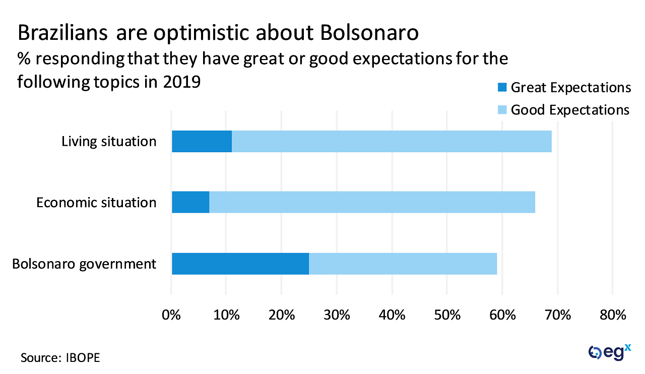 Brazil's new president, Jair Bolsonaro, was sworn into office on 1 January. Recently published polls suggest that Bolsonaro's approval ratings are quite high, hovering around 70%, providing him a tailwind at the start of his term.