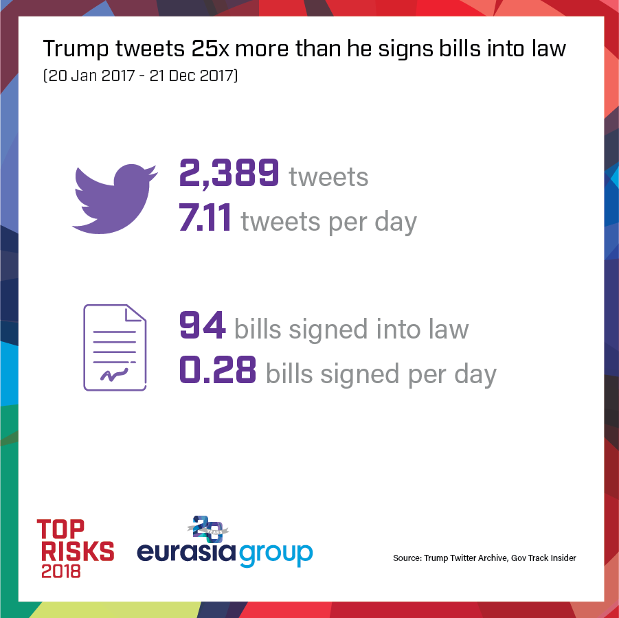For 2018, he can at most follow through on a limited number of ongoing legislative priorities and some executive orders. If there's a major crisis (please see risk #2: Accidents), we're all in trouble. Barring that, this is a White House that's headed toward massive distraction from a Mueller investigation nearing conclusion. That promises a year of blazing one-day headlines but almost nothing that moves the needle on policy.