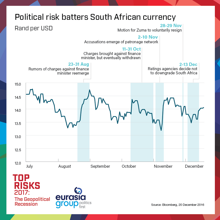 THE POLITICAL CRISIS pitting President Jacob Zuma against opponents within and beyond the ruling African National Congress (ANC) will worsen in 2017, putting the South African economy at greater risk and damaging regional stability. Having narrowly averted challenges to his leadership in 2016, Zuma will focus on domestic battles and dig in his heels this year, preventing reformers from taking needed steps to restore the country's economic stability. Internal ANC discord will weigh particularly on state-owned enterprise management. State-utility Eskom holds the largest share of government guarantees, and its balance sheet will loom over the sovereign rating for the medium to long term, particularly with a Zuma ally, Ben Ngubane, serving as chairman.