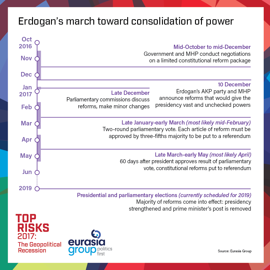 Finally, Erdogan's referendum victory is unlikely to offer much relief. The nationalist MHP has signed off on a reform package that includes almost every provision Erdogan wants for an unchecked executive presidential system. Yet, though most of these provisions won't go into effect until the next election in 2019, victory will embolden Erdogan to act as a de facto executive president and continue to overstep his formal powers throughout 2017. An empowered, post-referendum Erdogan will double down on his preferred policies, aggravating political, economic, and security risks.