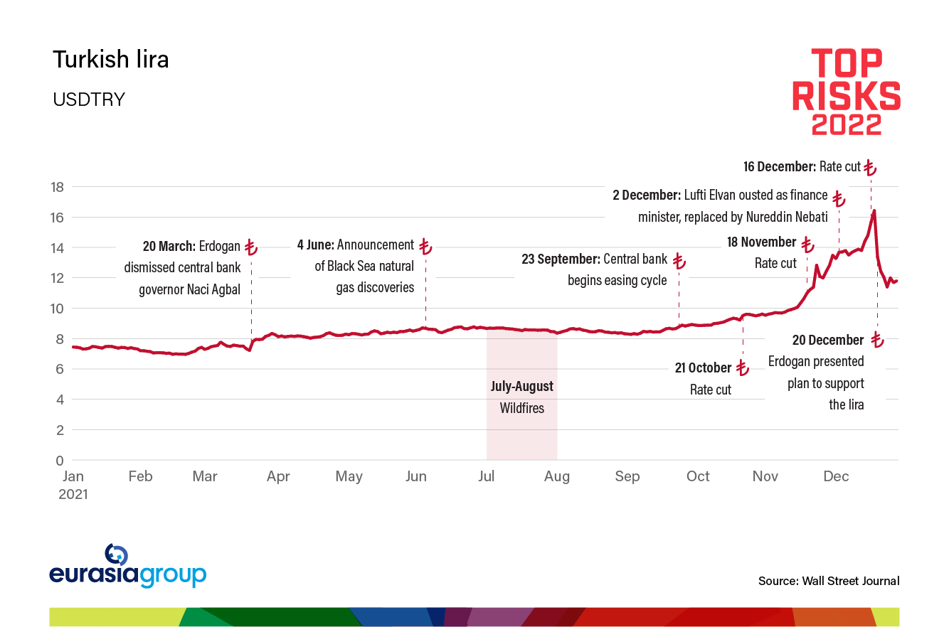 Erdogan's sights are set on 2023, but the impact of these policies will be felt this year. He will try to mollify households with renewed credit expansion, yet that risks feeding more dollarization. The central bank will do what the president asks, exacerbating balance-of-payment risks, given the need to roll over large amounts of external debt for the banking sector and corporates. There is a growing risk that Ankara will turn to market-unfriendly interventions, but none of these measures will stop the bleeding. New measures unveiled in late December will provide some short-term economic relief but stoke fiscal and inflationary risks that could lead to an accelerated economic unraveling.