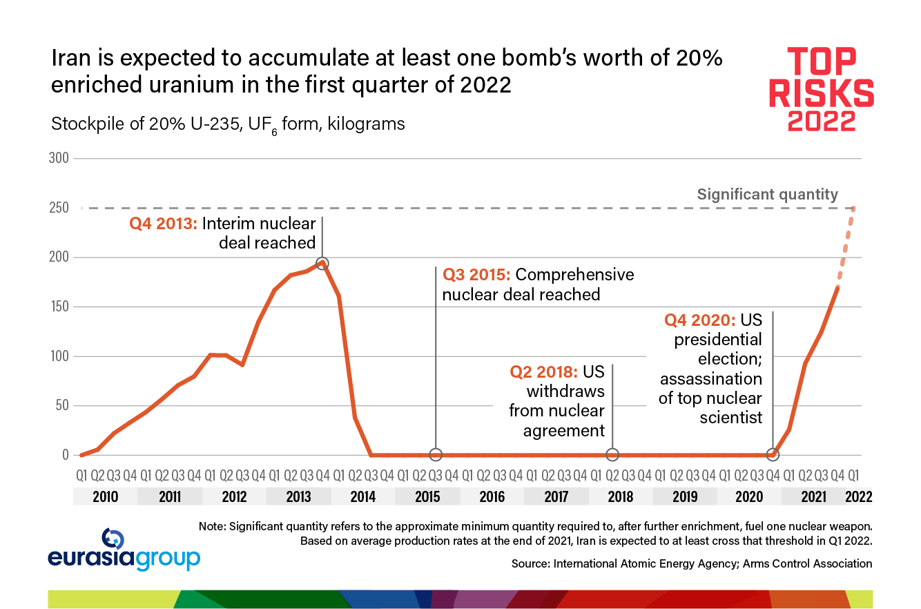 The US and Iran enter 2022 on the brink of crisis. Iran's nuclear program is advancing rapidly, unconstrained by the limits of the nuclear accord. With diplomacy on ice, Washington is groping for an alternative strategy to constrain Tehran and placate growing Israeli calls for aggressive action, but the Biden administration has limited options. Israel will increasingly take matters into its own hands—which once again raises the specter of Israeli strikes on Iranian nuclear facilities. These pressures will collide this year, leaving oil prices and regional states jittery and increasing the risk of conflict.