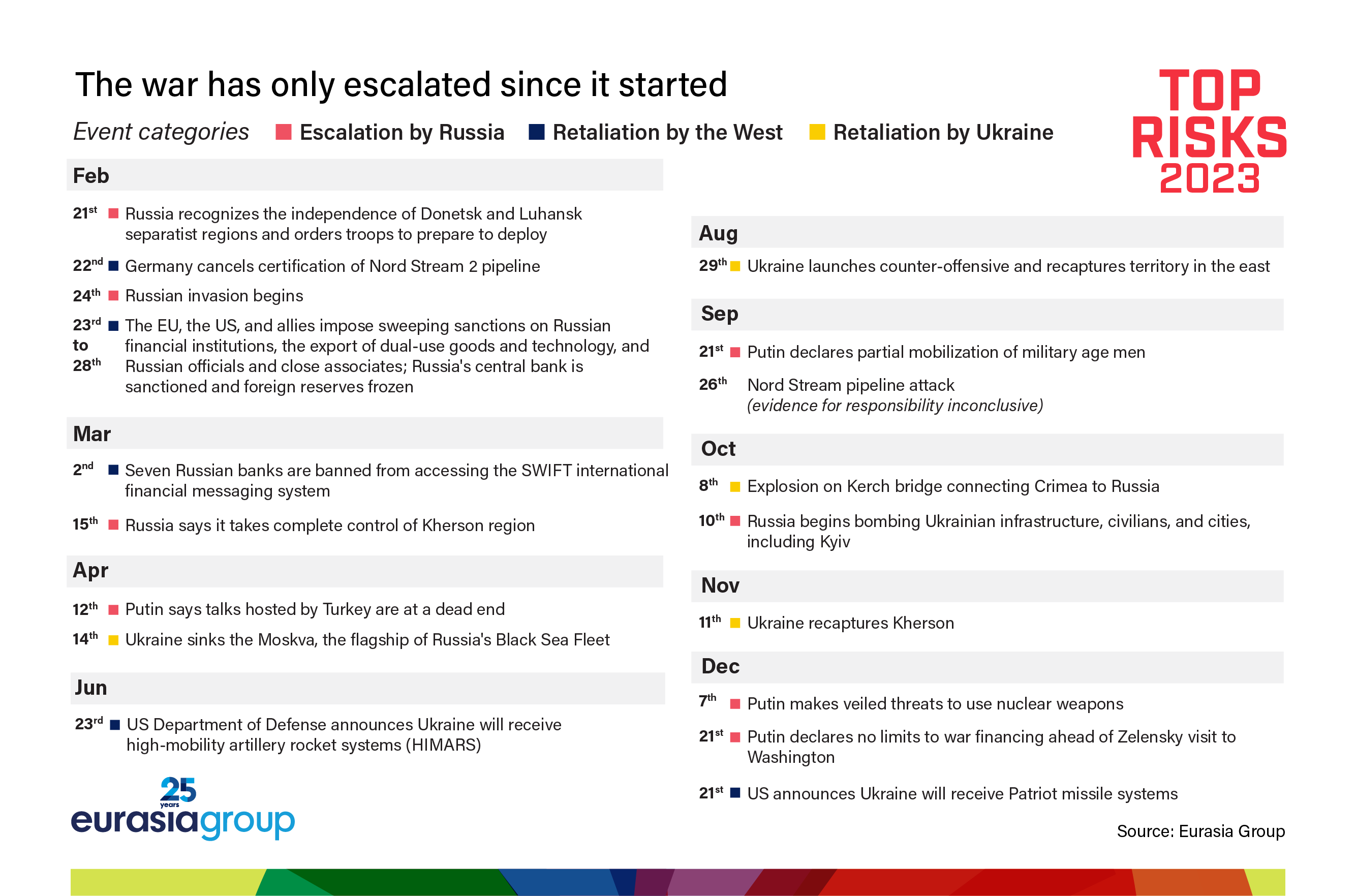 In 2022, despite much bluster directed at the West, the Kremlin was careful to keep its war on Ukraine contained within the country, avoiding direct confrontation with NATO and hoping to divide the united Western front in support of Kyiv. In 2023, Putin can't afford to be that cautious.